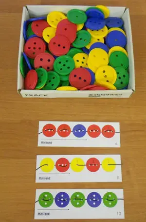 Ход игры: сортировать пуговицы по величине, по цвету, форме, по количеству дырочек, материалу. Строить ряды по возрастанию или убыванию размера, интенсивности цвета.