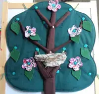 Игровой материал: Развивающий коврик или книжка дерево с пришитыми к кроне пуговицами, на которые можно пристегивать яблоки (можно сделать другие вариации в виде паровозика и вагончиков, елки и игрушек и т.д.)