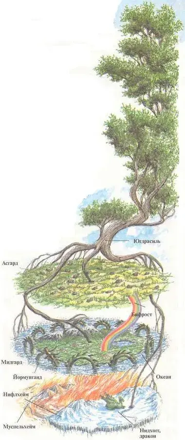 На нижнем ярусе находились страна смерти Нифлхейм - ледяная пустыня, и Муспельхейм, огненная земля. Все эти уровни Вселенной держали вместе гигантские корни волшебного ясеня, называвшегося Югдрасиль. (Учащимся предлагается сделать рисунок модели мира скандинавской мифологии в тетради).