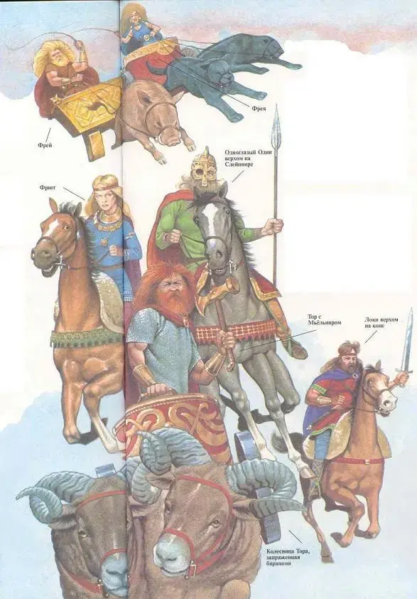 Верховный бог скандинавов - Один. Его одинаково страшились и люди, и боги. Будучи богом войны, он вызывал на земле войны, посылая вниз своё волшебное копьё. Он являлся также и богом поэзии, вдохновлявшим сказителей и поэтов викингов (их называли скальдами). У Одина был всего один глаз, ибо вторым он пожертвовал ради приобретения мудрости и знаний. Он ездил на великолепном восьминогом коне по имени Слейпнир. На его плечах сидели два ворона, которых звали Мысль и Память.