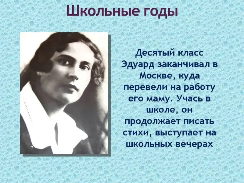 Десятый класс Эдуард заканчивал в Москве, куда перевели на работу его маму. Учась в школе, он продолжает писать стихи, выступает на школьных вечерах.