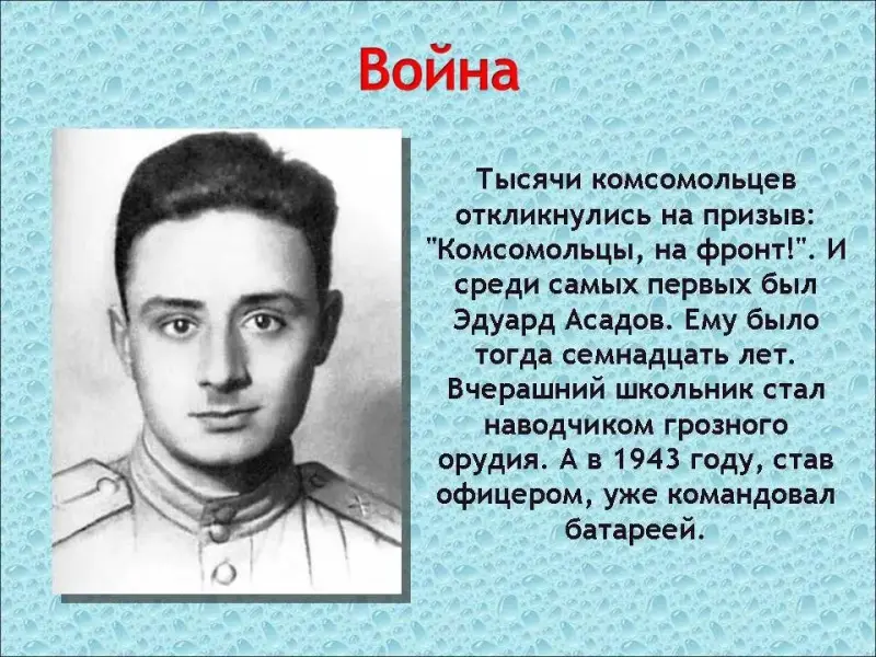 Как же сложилась судьба этого необыкновенного человека? Какими дорогами он пришел в поэзию? Какой же подвиг совершил этот человек? Ответы на эти вопросы дает сама жизнь поэта, жизнь, ставшая легендой. Итак, коротко о жизненном пути Э.Асадова.