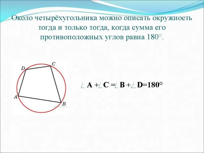 Задание 4. Cформулируйте и запишите условие, при котором около четырёхугольника можно описать окружность.