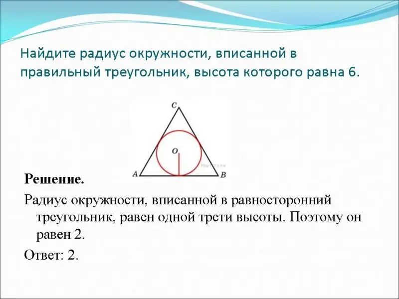 2.Найдите радиус окружности, вписанной в правильный треугольник, высота которого равна 6.