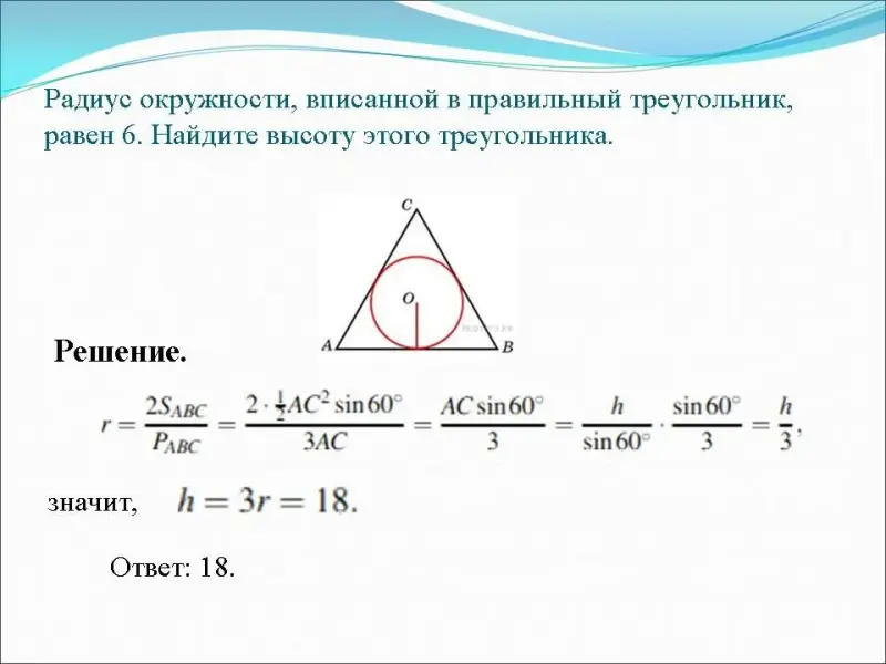 3.Радиус окружности, вписанной в правильный треугольник, равен 6. Найдите высоту этого треугольника.