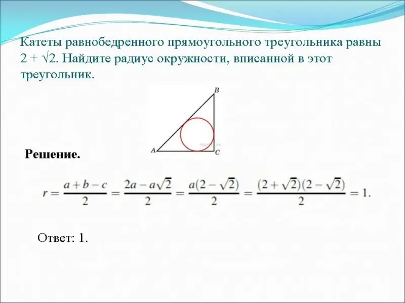 6.Катеты равнобедренного прямоугольного треугольника равны 2 + v2. Найдите радиус окружности, вписанной в этот треугольник.