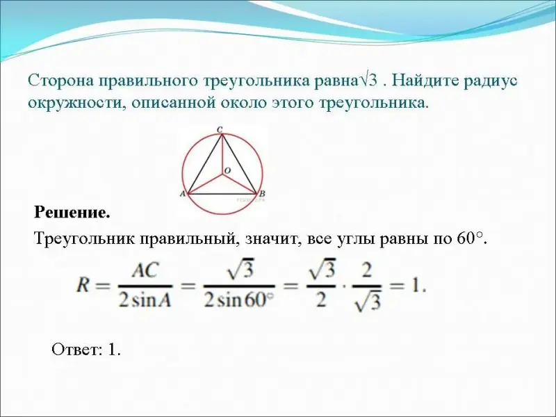 7.Сторона правильного треугольника равна v3. Найдите радиус окружности, описанной около этого треугольника.