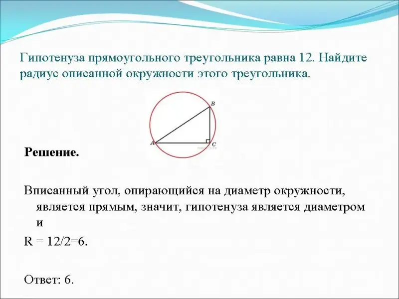 8.Гипотенуза прямоугольного треугольника равна 12. Найдите радиус описанной окружности этого треугольника.