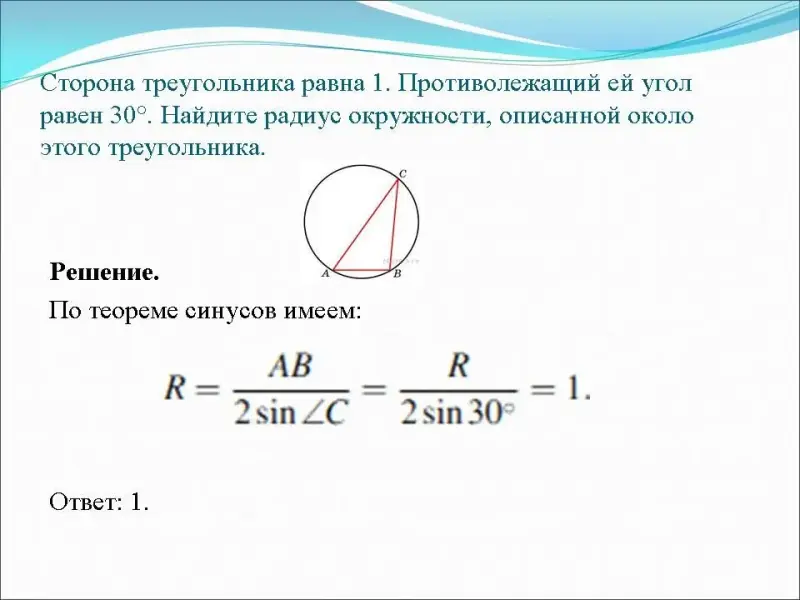 9.Сторона треугольника равна 1. Противолежащий ей угол равен 30°. Найдите радиус окружности, описанной около этого треугольника.