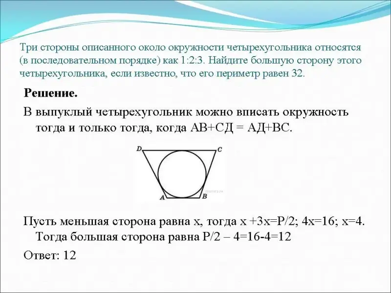 12.Три стороны описанного около окружности четырехугольника относятся (в последовательном порядке) как 1:2:3. Найдите большую сторону этого четырехугольника, если известно, что его периметр равен 32.