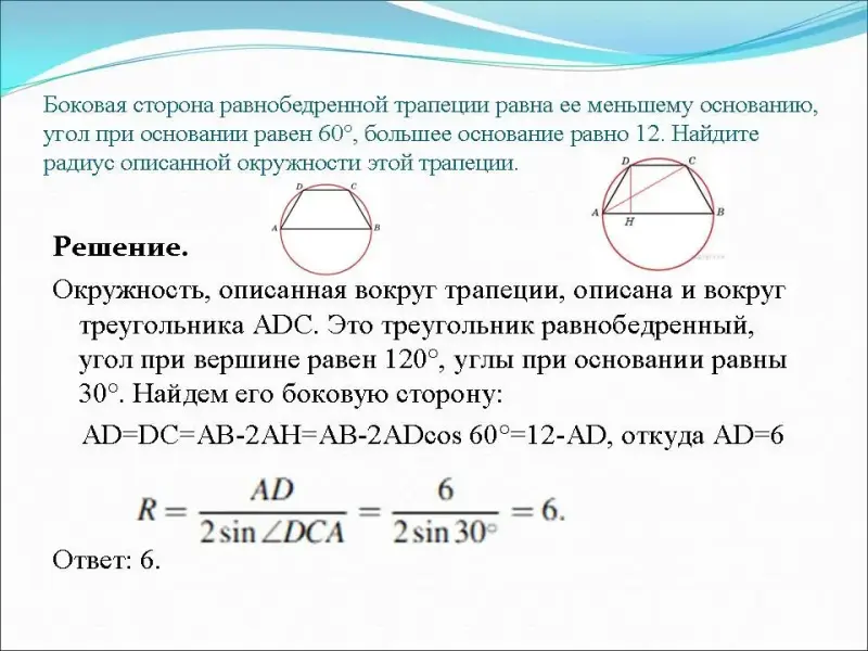 14.Боковая сторона равнобедренной трапеции равна ее меньшему основанию, угол при основании равен 60°, большее основание равно 12. Найдите радиус описанной окружности этой трапеции.