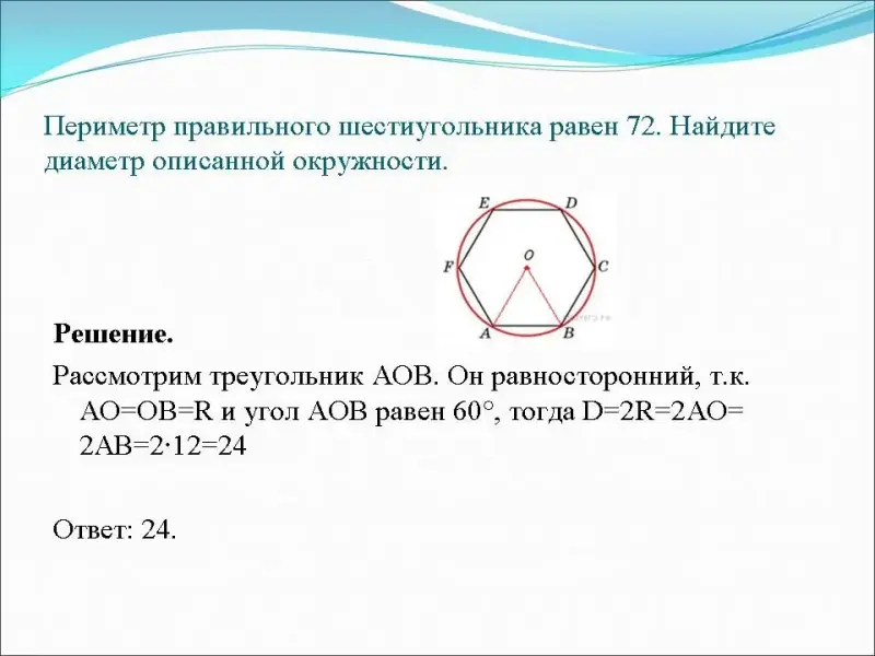 17.Периметр правильного шестиугольника равен 72. Найдите диаметр описанной окружности.