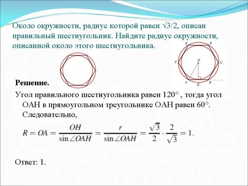 18.Около окружности, радиус которой равен v3/2, описан правильный шестиугольник. Найдите радиус окружности, описанной около этого шестиугольника.