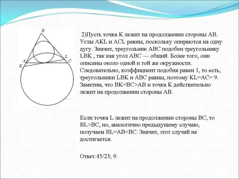C4-1. В треугольнике АВС известны стороны: АВ=6, ВС=8, АС=9. Окружность, проходящая через точки А и С, пересекает прямые ВА и ВС соответственно в точках K и L, отличных от вершин треугольника. Отрезок KL касается окружности, вписанной в треугольник ABC. Найдите длину отрезка KL.