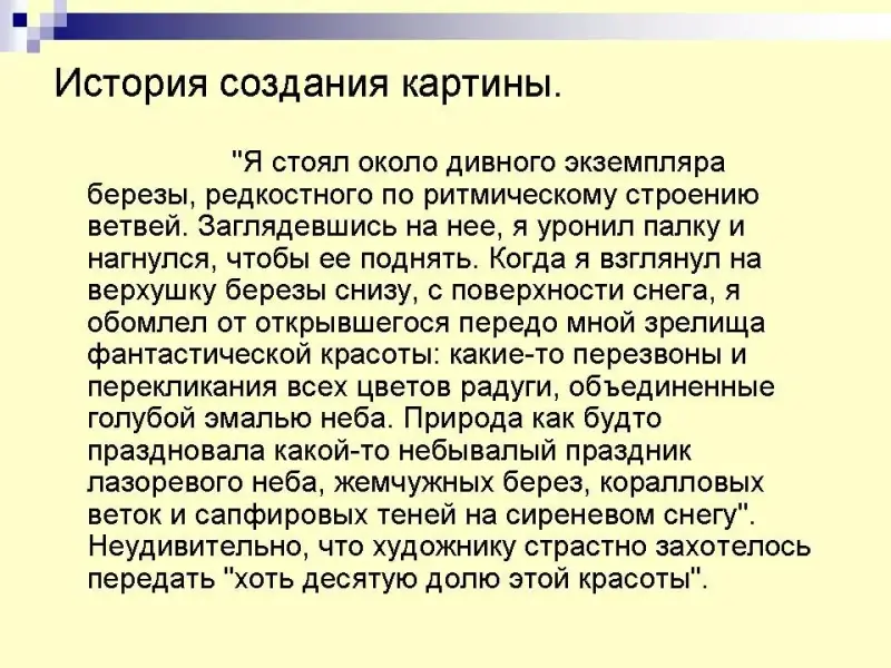 "Я стоял около дивного экземпляра березы, редкостного по ритмическому строению ветвей. Заглядевшись на нее, я уронил палку и нагнулся, чтобы ее поднять. Когда я взглянул на верхушку березы снизу, с поверхности снега, я обомлел от открывшегося передо мной зрелища фантастической красоты: какие-то перезвоны и перекликания всех цветов радуги, объединенные голубой эмалью неба. Природа как будто праздновала какой-то небывалый праздник лазоревого неба, жемчужных берез, коралловых веток и сапфировых теней на сиреневом снегу".