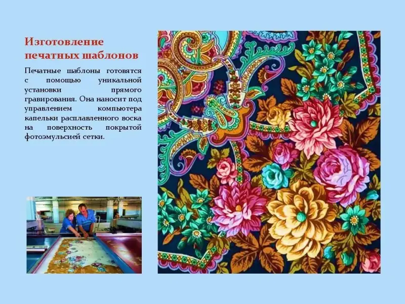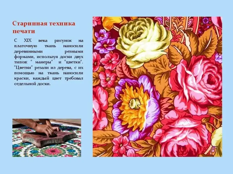 Техника ткачества позволяла тогда делать узоры одно- и двусторонними. Одним из ярких примеров традиций набивного рисунка являются платки и шали мануфактуры Лабзина и Грязнова из Павлово-Посада.