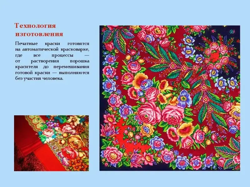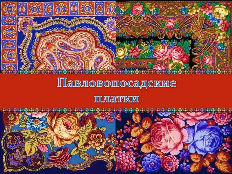 Показ 1-3-го слайдов.Среди известных всему миру уникальных изделий, составляющих гордость России, особое место занимают платки и шали из города Павловский Посад. Павловопосадская платочная мануфактура ежегодно выпускает около 400 видов шалей, платков, шарфов, кашне, палантинов, скатертей из шерсти, хлопка и шёлка.