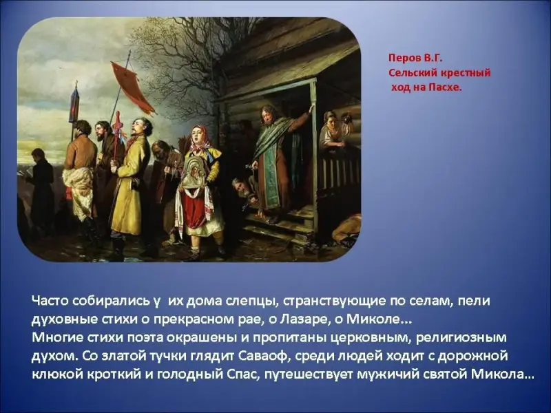 Часто собирались у нас дома слепцы, странствующие по сёлам, пели духовные стихи о прекрасном рае, о Лазаре, о Миколе...