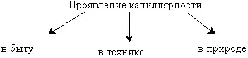 Учитель: ребята, на партах у вас находятся тексты о проявлении капиллярных явлений в технике, природе и быту. Почитайте этот текст и заполните таблицу или схему по вашему желанию.
