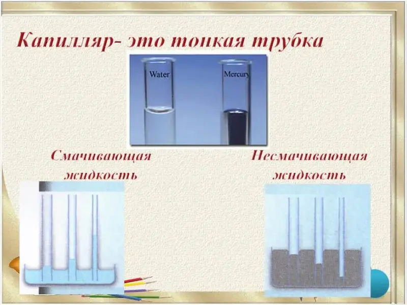 Учитель: посмотрите, смачивающая жидкость поднимается у края вверх, а несмачивающая закругляется вниз.