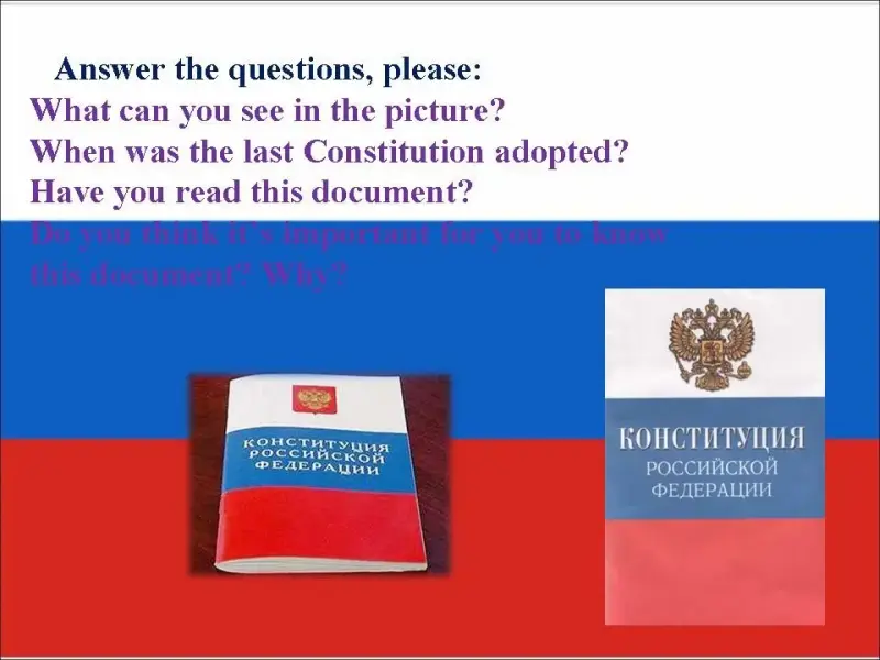 - We know that this year we celebrate the 20th anniversary of the Constitution of the Russian Federation. It is important for people all over the Russian Federation. Now you will read the text about it: