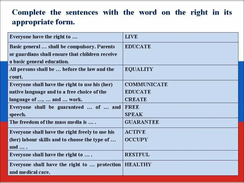 4. In this table you can read the extracts from the Constitution. Complete the sentences with the word on the right in its appropriate form.