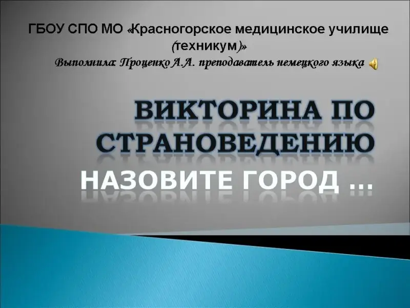 Как члены мирового сообщества, в условиях мировой глобализации и интеграции необходимо, как можно больше знать о других странах, об их истории, культуре и достопримечательностях. Данная презентация называется "Назовите город …" и используется в качестве основного материала для викторины по страноведению в средних и старших классах общеобразовательных школ или на первом курсе учреждений среднего профессионального образования.