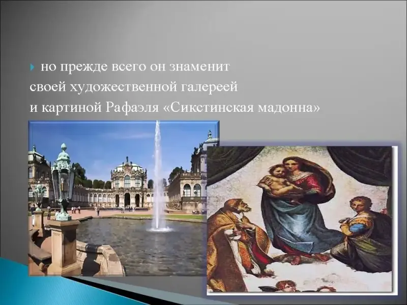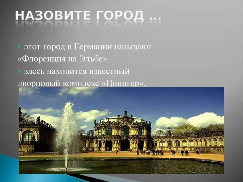 1. Этот город в Германии называют "Флоренция на Эльбе", здесь находится известный дворцовый комплекс "Цвингер", здесь есть музей гигиены, но прежде всего он знаменит своей художественной галереей и картиной Рафаэля "Сикстинская мадонна"
