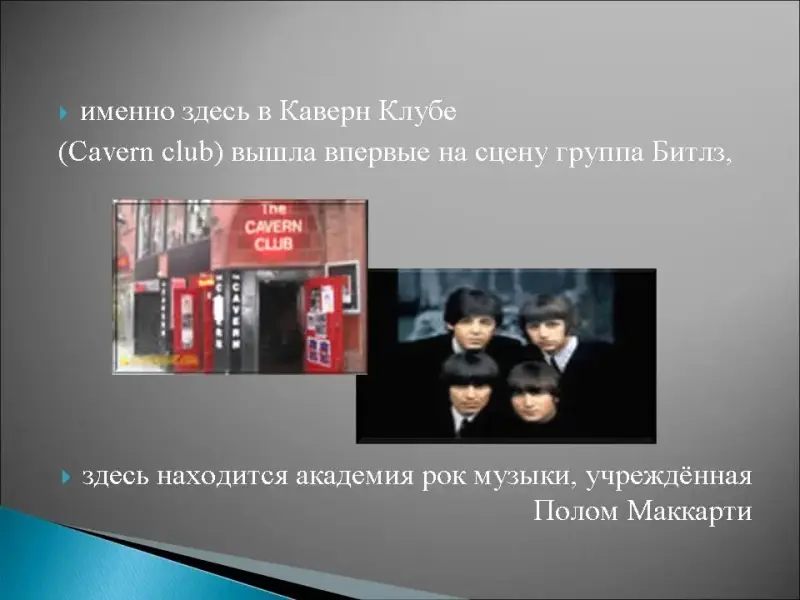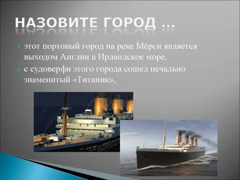 2. Этот портовый город на реке Мёрси является выходом Англии в Ирландское море, с судоверфи этого города сошел печально знаменитый "Титаник", именно здесь на игре городской футбольной команды был спет впервые гимн футбольных болельщиков "Ты никогда не будешь один", именно здесь в Каверн Клубе (Cavern club) вышла впервые на сцену группа Битлз, здесь находится академия рок музыки, учреждённая Полом Маккарти