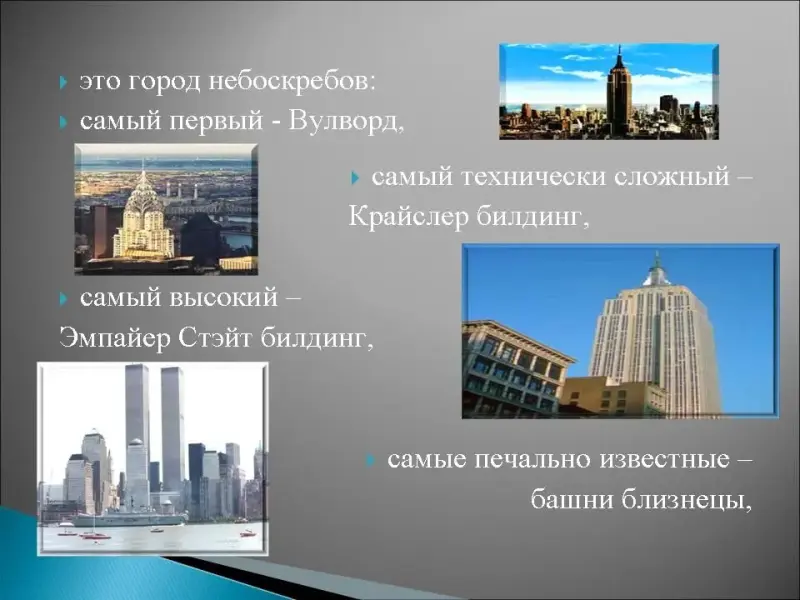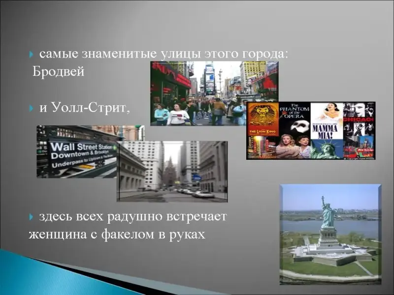 3. Этот город-штат расположен в устье рек Гудзон и Истривер, он служил воротами в Америку, здесь находится аэропорт Джона Кеннеди, в любви этому городу признавался Фрэнк Синатра, это город небоскребов: самый первый - Вулворд, самый технически сложный - Крайслер билдинг, самый высокий - Эмпайер Стэйт билдинг, самые печально известные - башни близнецы, самые знаменитые улицы этого города: Бродвей и Уолл-Стрит, здесь всех радушно встречает женщина с факелом в руках