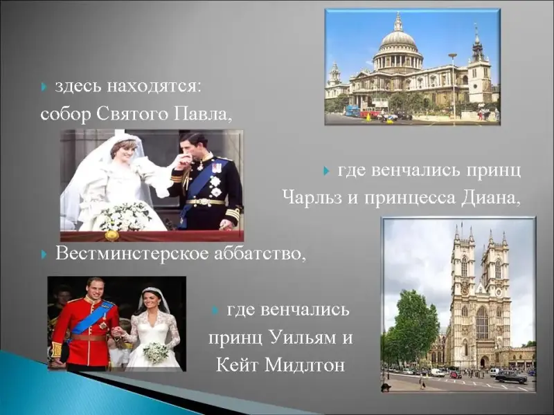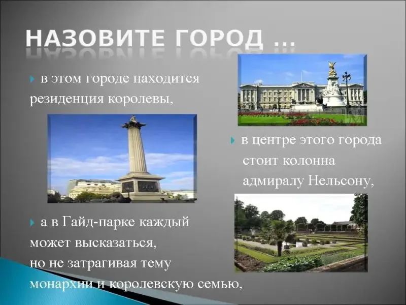5. В этом городе находится резиденция королевы, в центре этого города стоит колонна адмиралу Нельсону, а в Гайд-парке каждый может высказаться, но не затрагивая тему монархии и королевскую семью, здесь в 1894году был построен великолепный мост в викторианском стиле, здесь находятся: собор Святого Павла, где венчались принц Чарльз и принцесса Диана, Вестминстерское аббатство, где венчались принц Уильям и Кейт Мидлтон