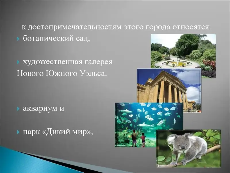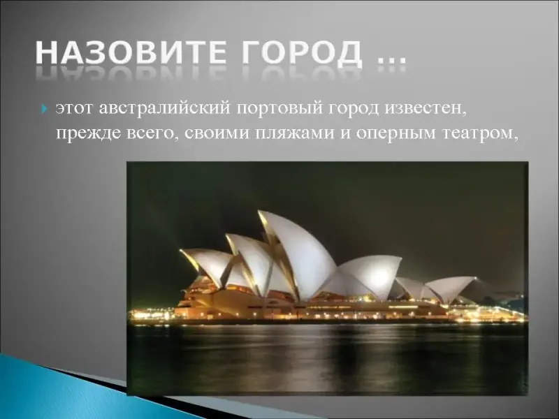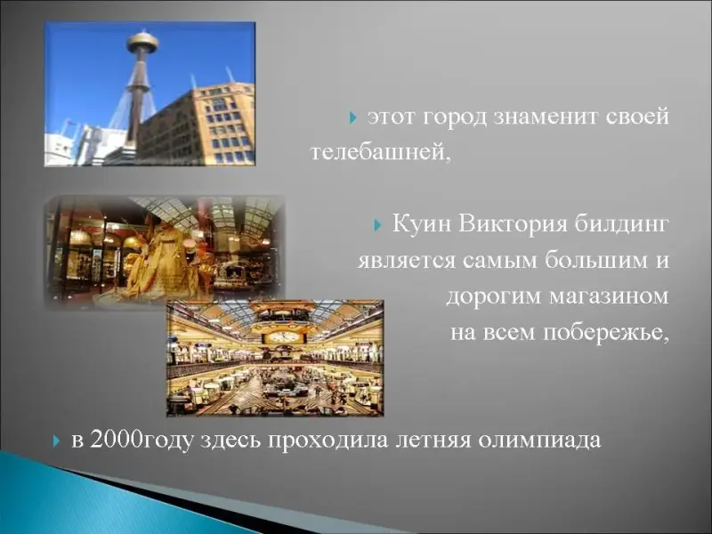 6. Этот австралийский портовый город известен, прежде всего, своими пляжами и оперным театром, к достопримечательностям этого города относятся: ботанический сад, художественная галерея Нового Южного Уэльса, аквариум и парк "Дикий мир", этот город знаменит своей телебашней, Куин Виктория билдинг является самым большим и дорогим магазином на всем побережье, в 2000году здесь проходила летняя олимпиада