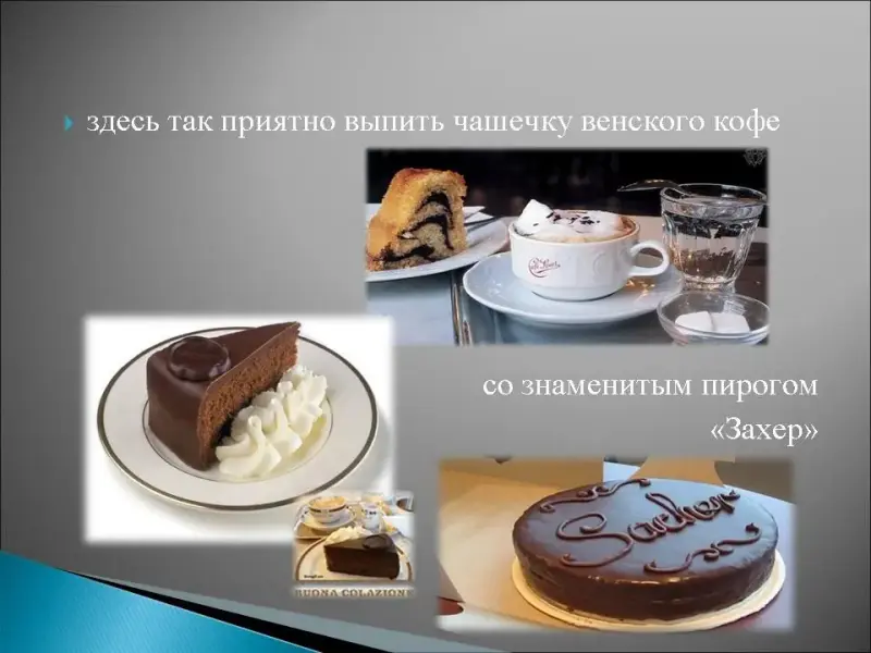 7. Этот австрийский город называют "мировой столицей музыки", здесь обрели свою славу: Гайдн, Моцарт, Шуберт, этому городу посвятил свой вальс Штраус, здесь находится самый красивый храм в стиле барокко - Карлскирхе, императорский дворец дома Габсбургов - Хофбург, дворец Шёнбрунн, здесь так приятно выпить чашечку венского кофе со знаменитым пирогом "Захер"