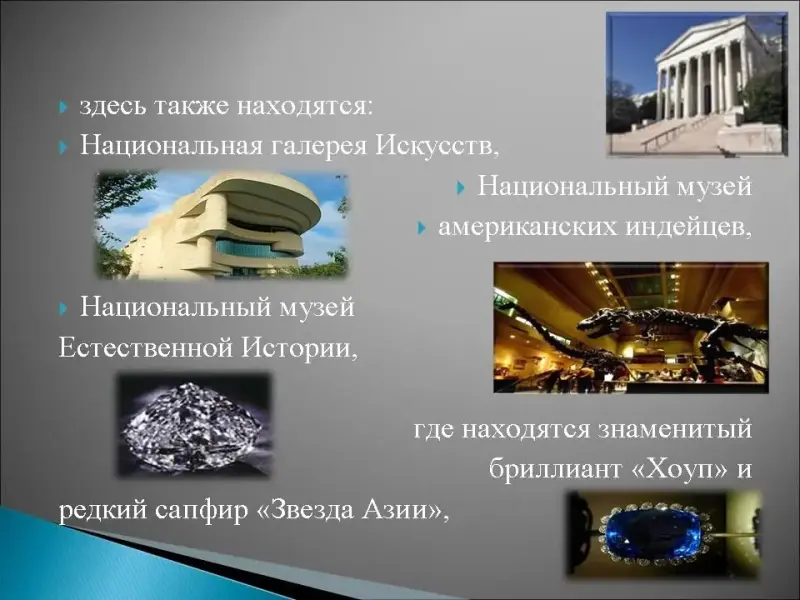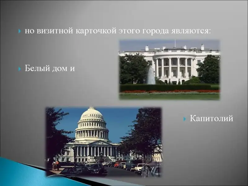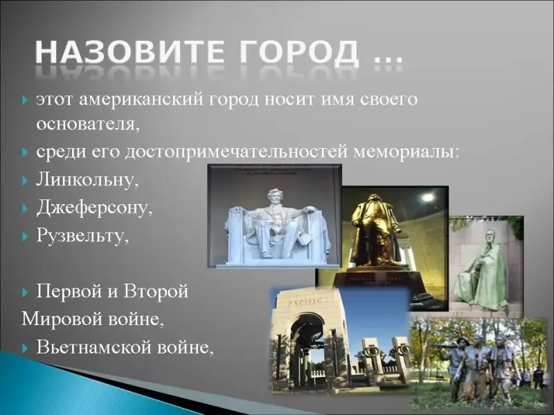 8. Этот американский город носит имя своего основателя, среди его достопримечательностей мемориалы: Линкольну, Джеферсону, Рузвельту, Первой и Второй Мировой войне, Вьетнамской войне, здесь также находятся: Национальная галерея Искусств, Национальный музей американских индейцев, Национальный музей Естественной Истории, где находятся знаменитый бриллиант "Хоуп" и редкий сапфир "Звезда Азии", но визитной карточкой этого города являются Белый дом и Капитолий