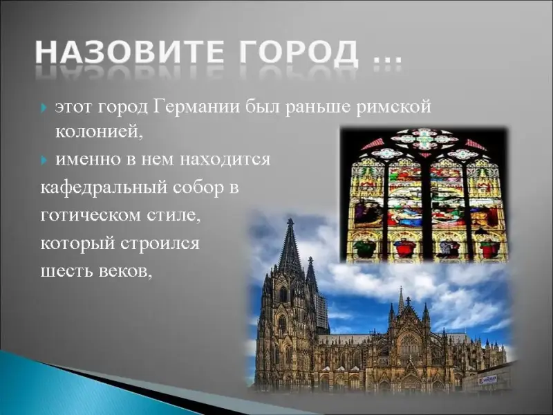 9. Этот город Германии был раньше римской колонией, именно в нем находится кафедральный собор в готическом стиле, который строился шесть веков, он славится своим шоколадом и знаменит тем, что здесь появился первый одеколон