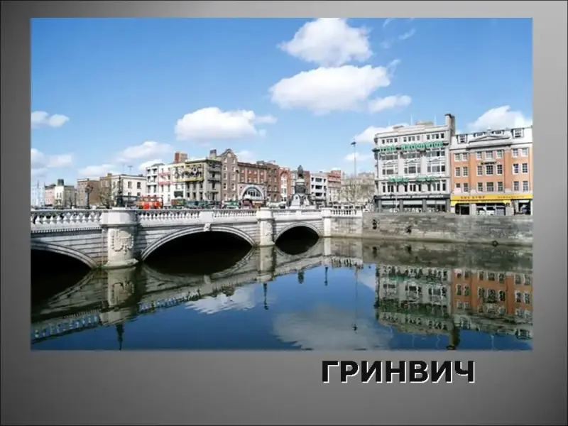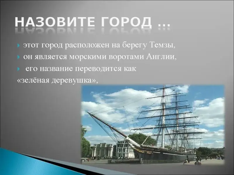 10. Этот город расположен на берегу Темзы, он является морскими воротами Англии, его название переводится как "зелёная деревушка", здесь находятся: палата мер и весов, нулевой меридиан, отделяющий восточное полушарие от западного, королевская обсерватория и самая старая морская школа