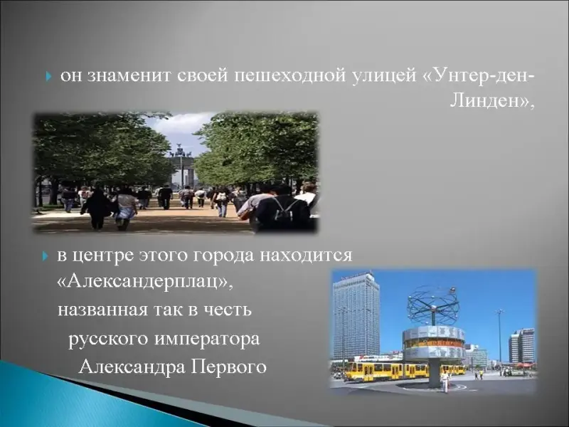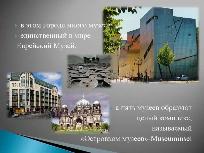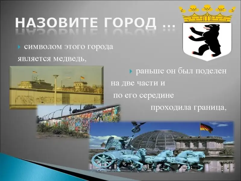 12. Символом этого города является медведь, раньше он был поделен на две части и по его середине проходила граница, в этом городе много музеев, например единственный в мире Еврейский Музей, а пять музеев образуют целый комплекс, называемый "Островком музеев"- Museuminsel, он знаменит своей пешеходной улицей "Унтер-ден-Линден", в центре этого города находится "Александерплац", названная так в честь русского императора Александра Первого