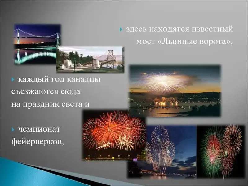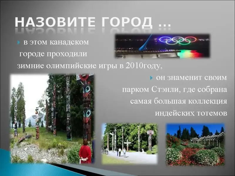 13. В этом канадском городе проходили зимние олимпийские игры в 2010 году, он знаменит своим парком Стэнли, где собрана самая большая коллекция индейских тотемов, здесь находятся известный мост "Львиные ворота", каждый год канадцы съезжаются сюда на праздник света и чемпионат фейерверков, но прежде всего он знаменит своей хоккейной командой