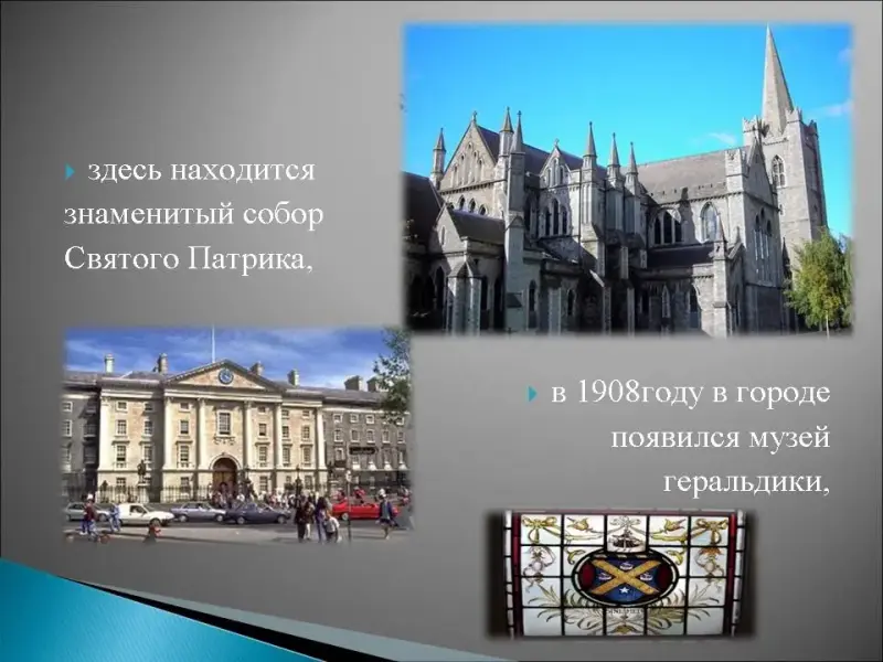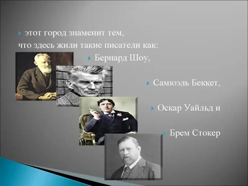 14. Этот город находится между рекой Лиффи и Ирландским морем, он был основан викингами и его название переводится как "Черная вода", в этом городе была летняя резиденция английского вице короля Ирландии - Блэкрокк Хаус, здесь находится знаменитый собор Святого Патрика, в 1908году в городе появился музей геральдики, этот город знаменит тем, что здесь жили такие писатели как: Бернард Шоу, Самюэль Беккет, Оскар Уайльд и Брем Стокер