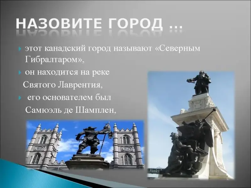 15. Этот канадский город называют северным Гибралтаром, он находится на реке Святого Лаврентия, его основателем был Самюэль де Шамплен, это город музеев, например: Музей Французской Америки, Музей Цивилизации, музей пчел и мёда, музей шоколада Эрико, музей ликёров; этот город известен своими парками: парк бизонов, парк Шют-Монморанси, где находится каскадный водопад Монморанси