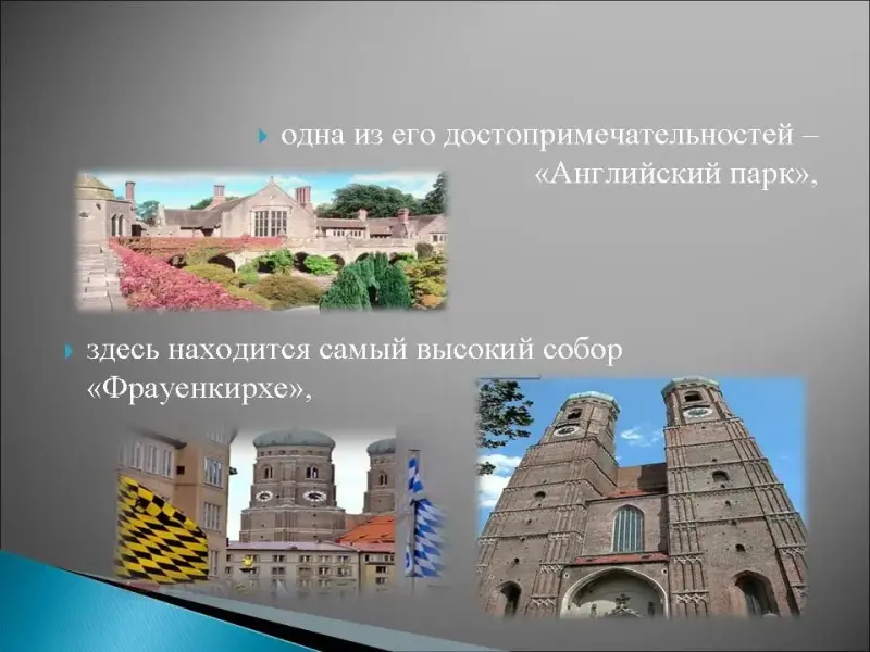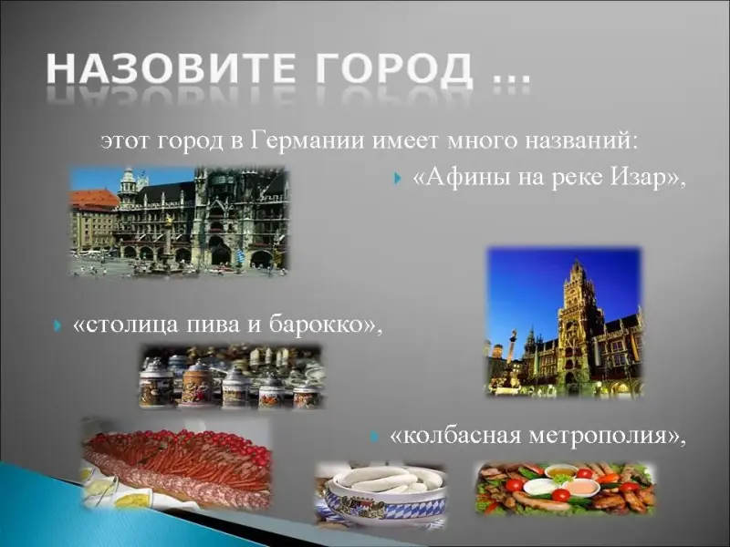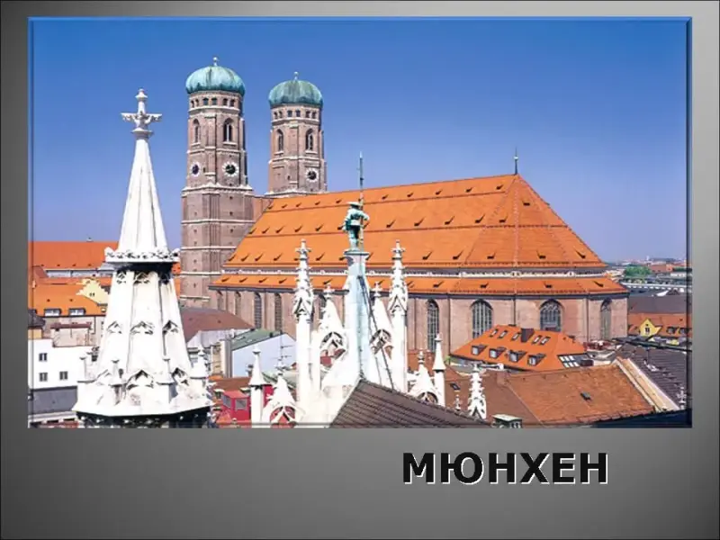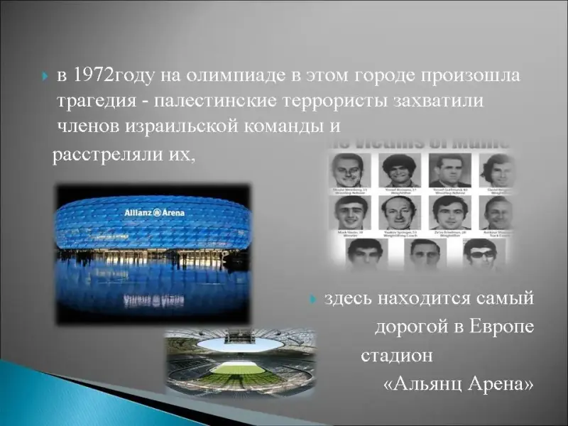 16. Этот город в Германии имеет много названий: "Афины на реке Изар", "столица пива и барокко", "колбасная метрополия", одна из его достопримечательностей - "Английский парк", здесь находится самый высокий собор "Фрауенкирхе", в 1972 году на олимпиаде в этом городе произошла трагедия - палестинские террористы захватили членов израильской команды и расстреляли их, здесь находится самый дорогой в Европе стадион "Альянц Арена"
