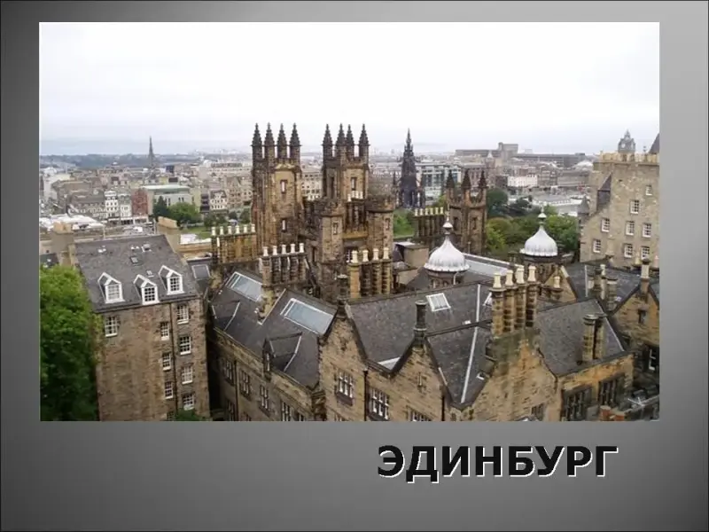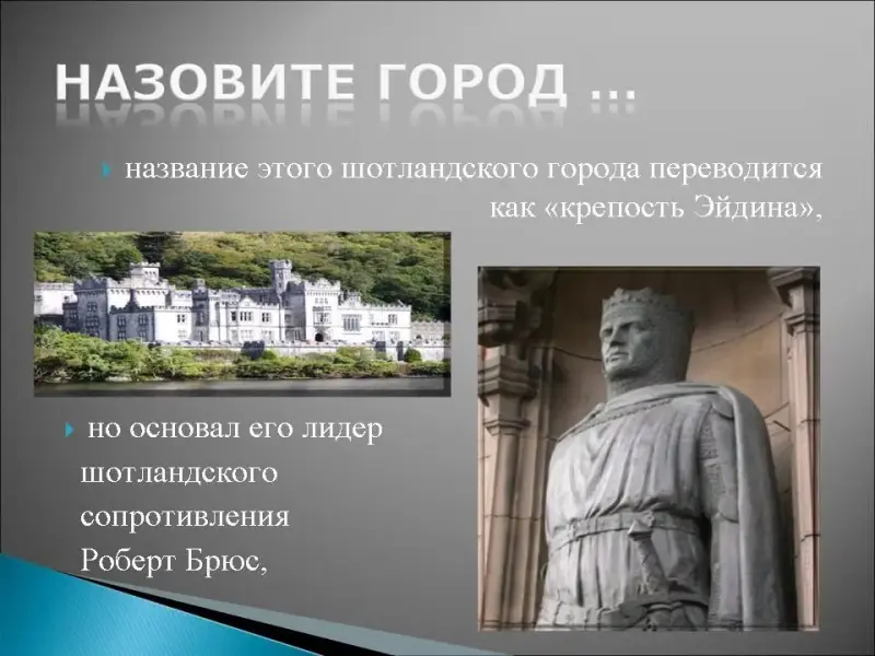 17. Название этого шотландского города переводится как "крепость Эйдина", но основал его лидер шотландского сопротивления Роберт Брюс, в этом городе была резиденция шотландской королевы Марии Стюарт в замке Кастл-Рокк, главная улица этого города "Королевская миля", здесь проводится фестиваль "Фриндж" - праздник музыки и театра, в этом городе жили: Вальтер Скотт, Роберт Бернс и Роберт Стивенсон