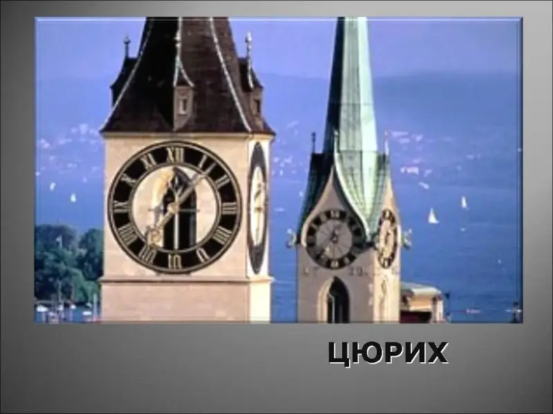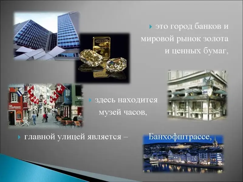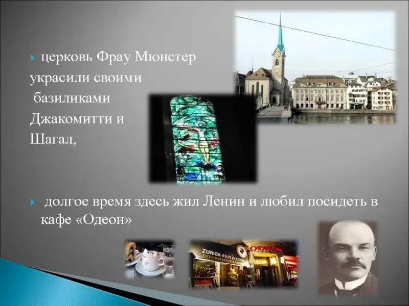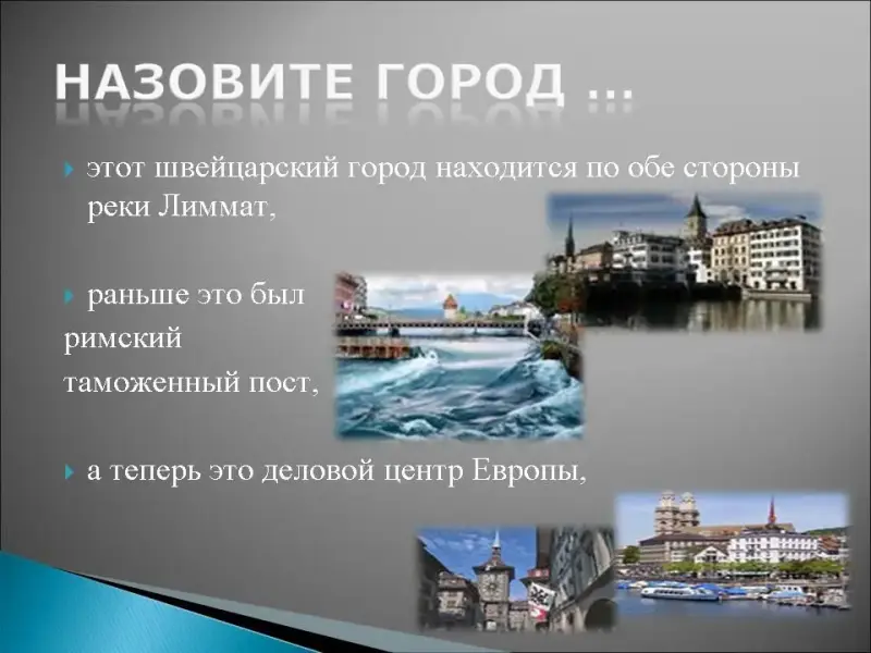 18. Этот швейцарский город находится по обе стороны реки Лиммат, раньше это был римский таможенный пост, а теперь это деловой центр Европы, это город банков и мировой рынок золота и ценных бумаг, здесь находится музей часов, главной улицей является - Банхофштрассе, церковь Фрау Мюнстер украсили своими базиликами Джакомитти и Шагал, долгое время здесь жил Ленин и любил посидеть в кафе "Одеон"