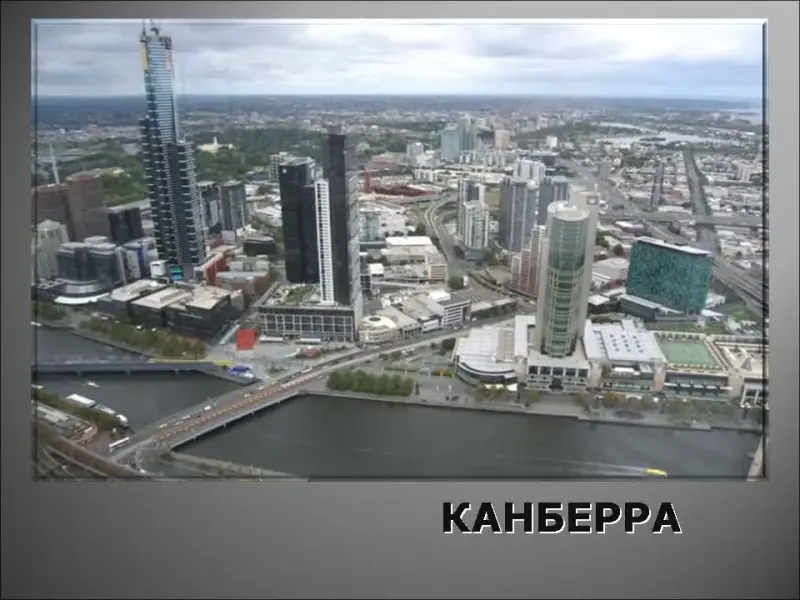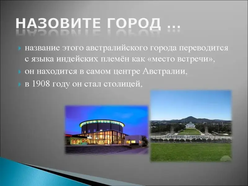 19. Название этого австралийского города переводится с языка индейских племён как "место встречи", он находится в самом центре Австралии, в 1908 году он стал столицей, в этом городе находится искусственное озеро "Барли Гриффин", здесь есть единственный горнолыжный курорт "Тредбо"