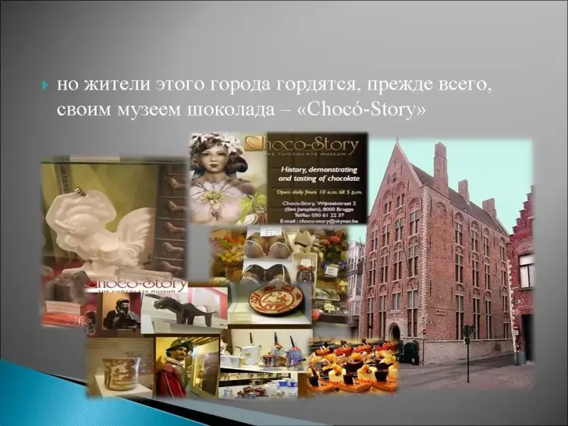 21. Этот бельгийский город называют "Северной Венецией", в нем находится церковь Богоматери, фрески которой расписывал сам Микеланджело, здесь находится музей Сальвадора Дали, средневековая сторожевая башня Беффруа, высотой 84 метра, но жители этого города гордятся, прежде всего, своим музеем шоколада - "Choco-Story"