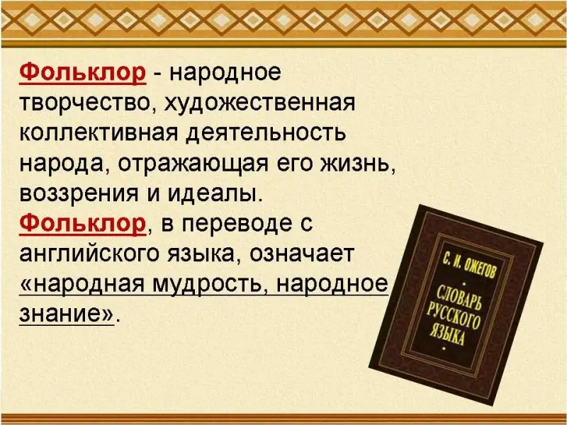 Фольклор, в переводе с английского языка, означает "народная мудрость, народное знание".