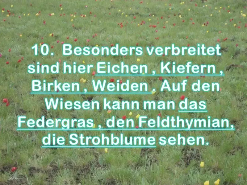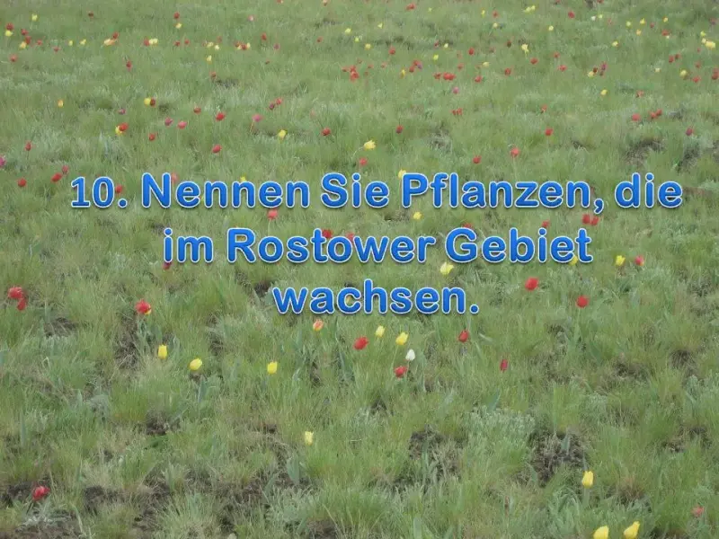 | 10. Nennen Sie Pflanzen, die im Rostower Gebiet wachsen. | 10. Besonders verbreitet sind hier Eichen , Kiefern , Birken , Weiden . Auf den Wiesen kann man das Federgras , den Feldthymian, die Strohblume sehen. |