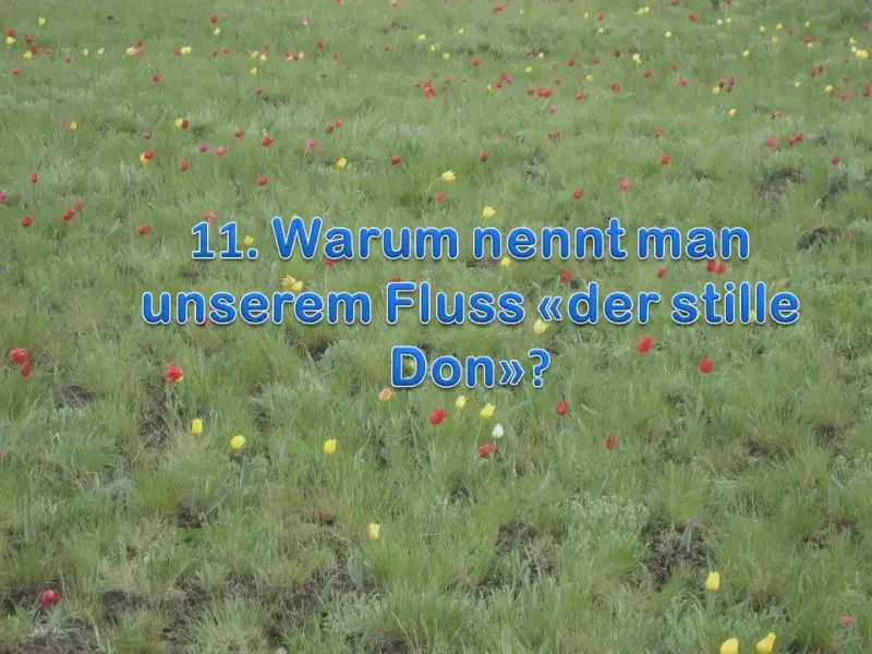 | 11. Warum nennt man unserem Fluss «der stille Don»? | 11. Die Strömung des Flusses ist kaum zu sehen , so langsam und ruhig sie ist, daher kommt der Name «der Stille Don». |