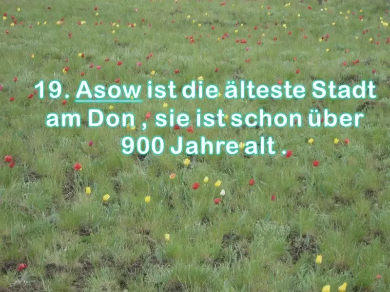 | 19. Nennen Sie die älteste Stadt im Rostower Gebiet. | 19. Asow ist die älteste Stadt am Don , sie ist schon über 900 Jahre alt . |