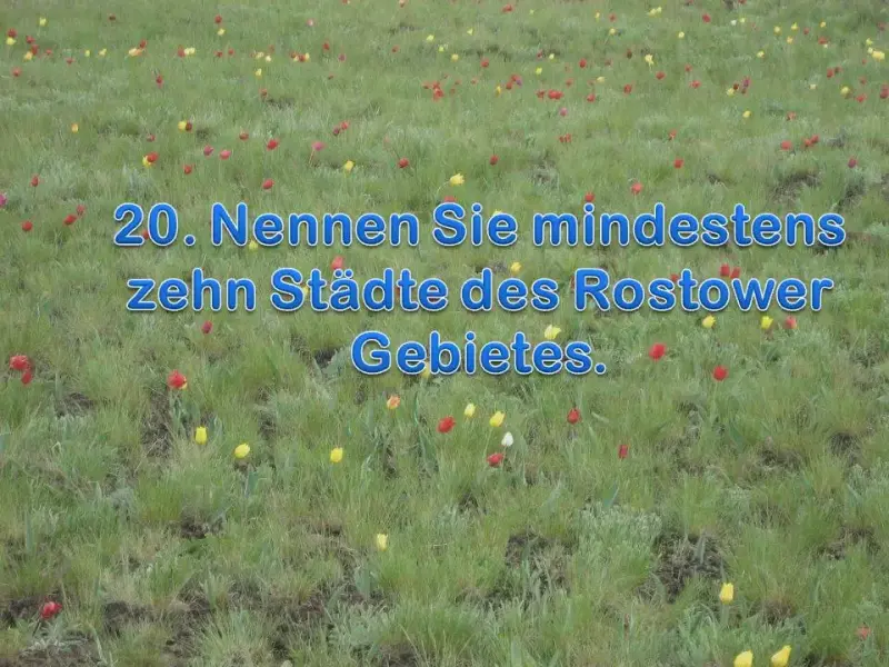 | 20. Nennen Sie mindestens zehn Städte des Rostower Gebietes. | 20.Diese Städte sind Rostow, Nowotscherkassk, Wolgodonsk, Millerowo, Salsk, Taganrog, Asow, Schachty, Belaja Kalitwa, Swerewo. |